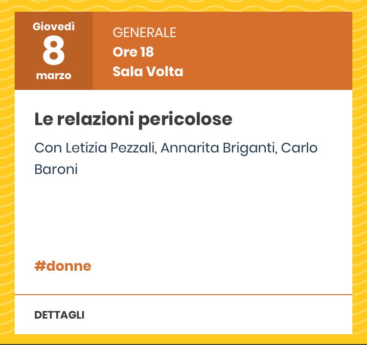 Durante l’8 marzo la fiera vuole celebrare la donna con un appuntamento particolare dedicato a Le relazioni pericolose, che si terrà alle ore 18:00 presso la Sala Volta.